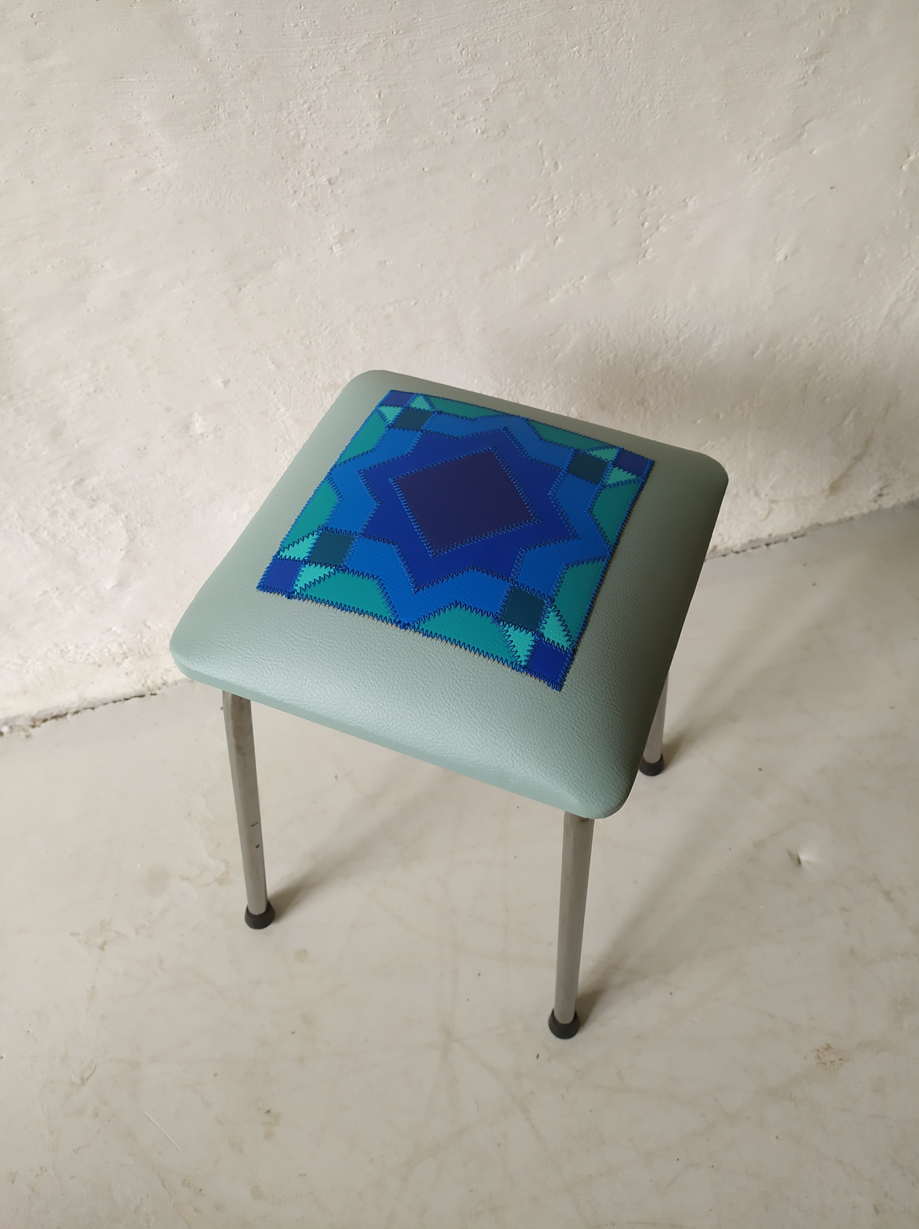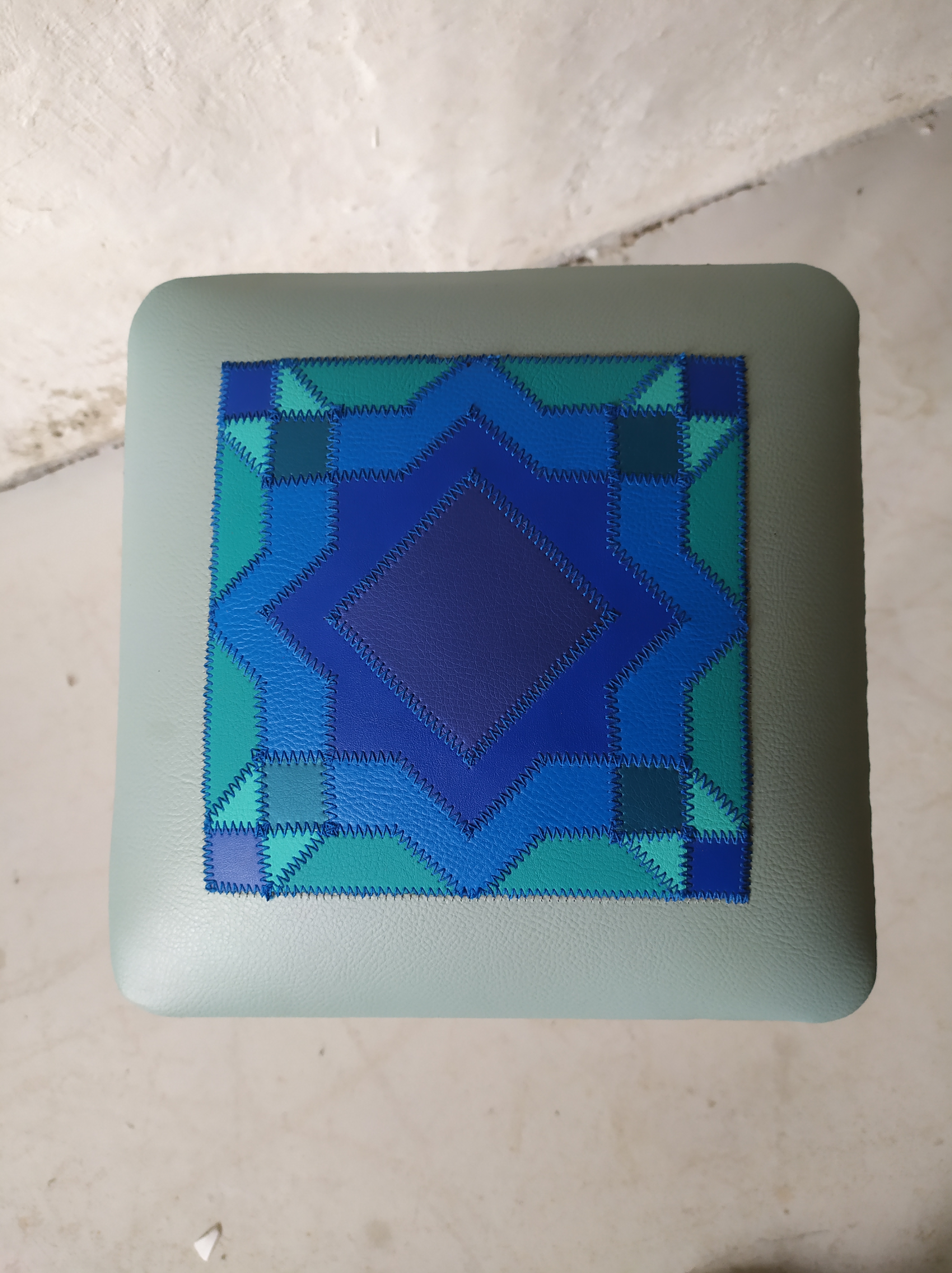 Tabouret Essaouira -Tabourets -, Meubles création de tissu Prix de vente:70 € Tabouret années 60 restauré avec des motifs géométriques en similicuir dans un camaïeu de bleu assemblés avec des couture bleu. N’hésitez pas à me contacter pour plus de renseignements.