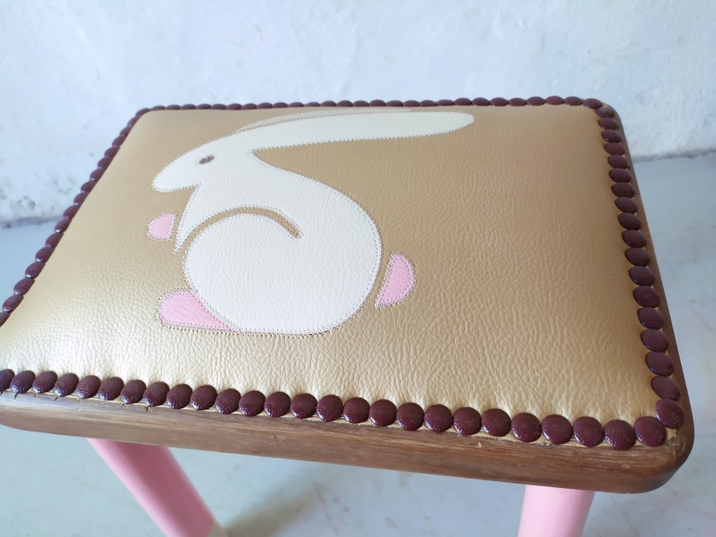 Tabouret enfant avec une assise en bois plein. Création d’une garniture moderne en mousse et habillée en similicuir avec un patchwork représentant un lapin dans les couleur blanc, rose et beige sur un fond de similicuir doré. Bois des pieds peint en blanc casé et rose. Finition clous décoratif bordeaux.