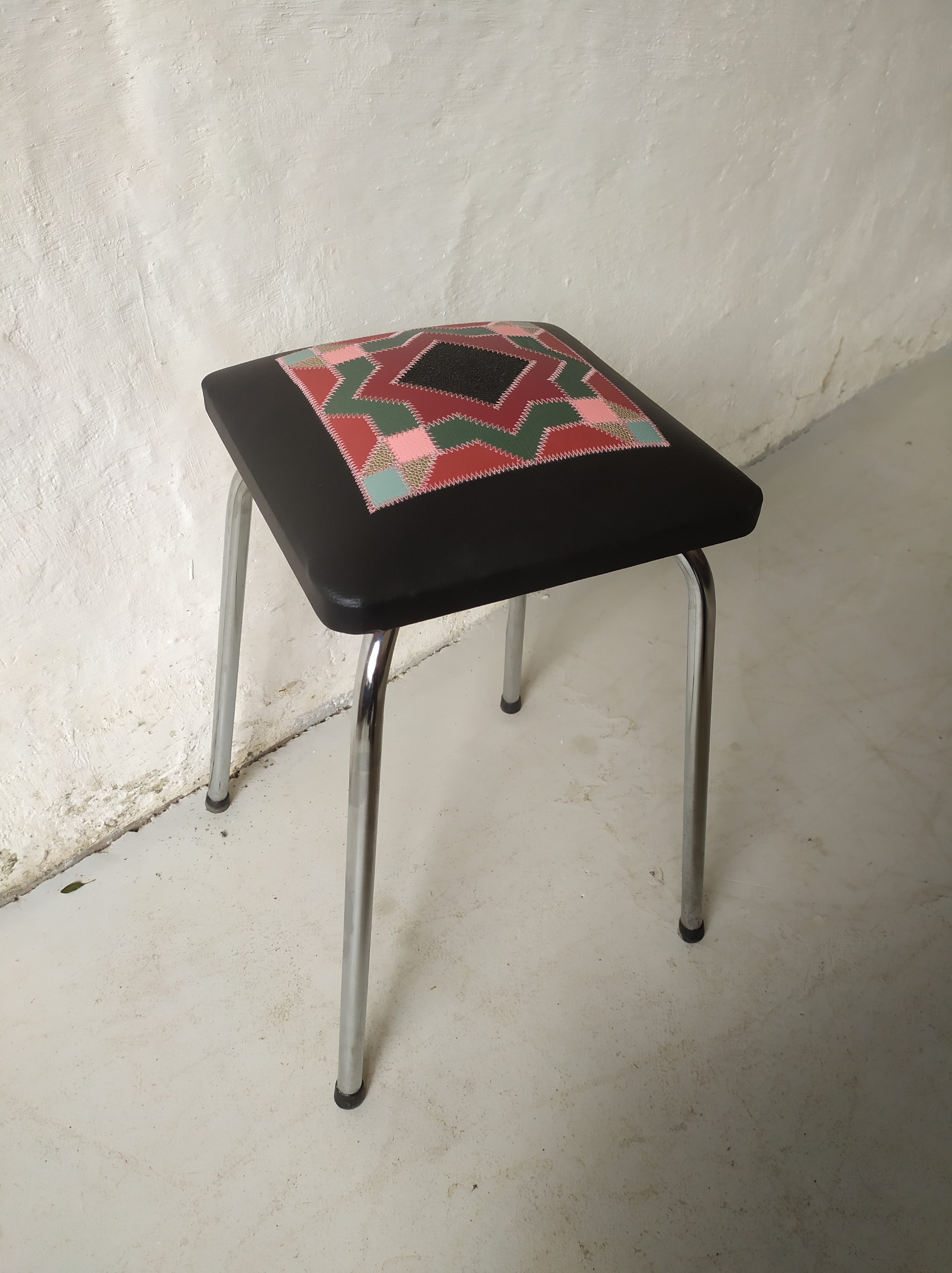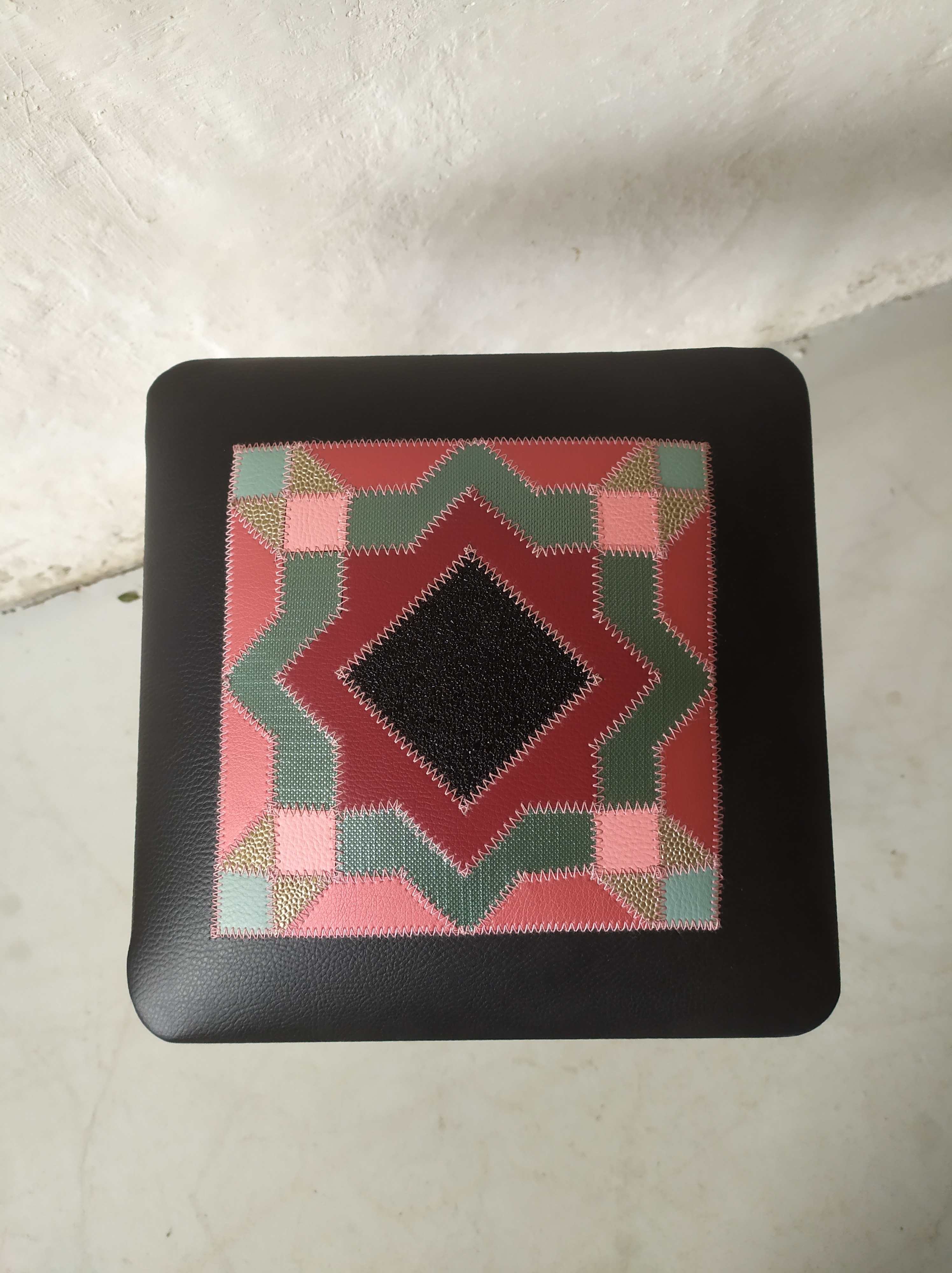 Tabouret Essaouira -Tabourets -, Meubles création de tissu Prix de vente:70 € l’unité Tabouret années 60 restauré avec des motifs géométriques en similicuir dans un mélange de rose noir et vert d’eau assemblés avec des couture roses. N’hésitez pas à me contacter pour plus de renseignements.