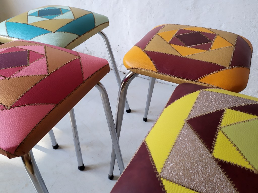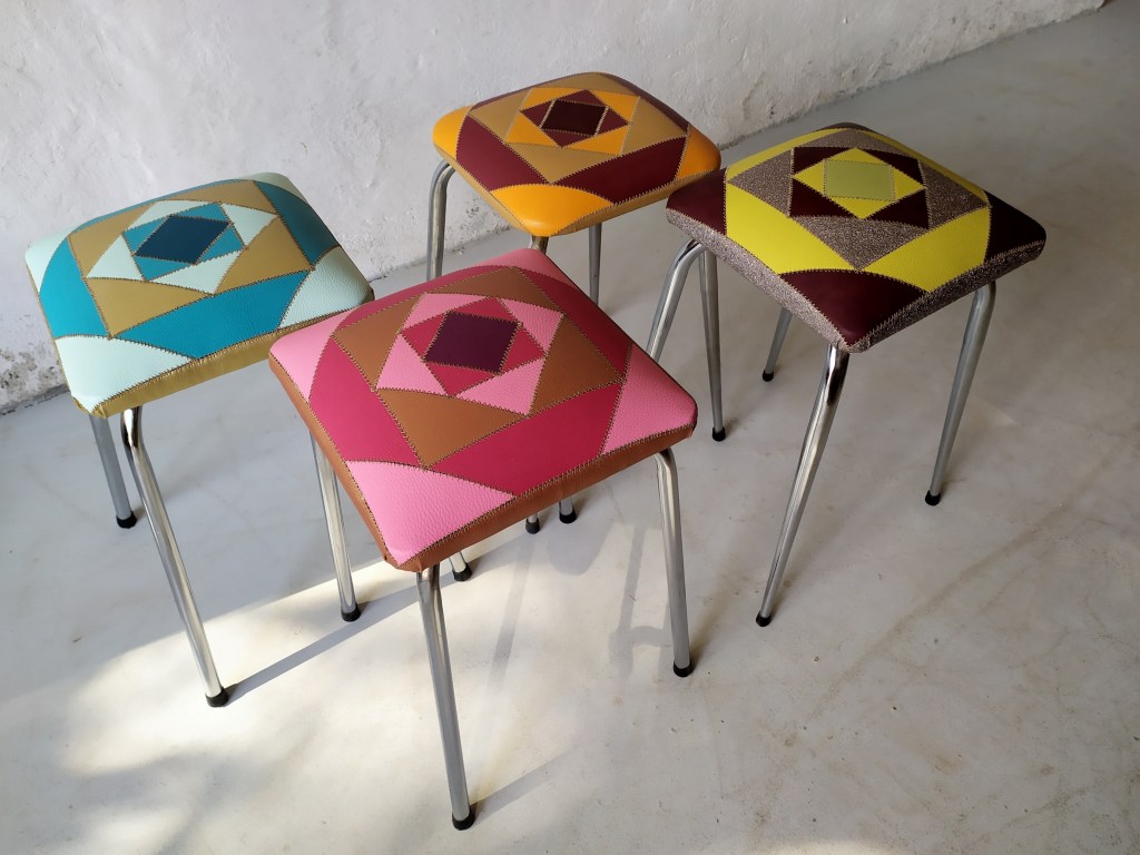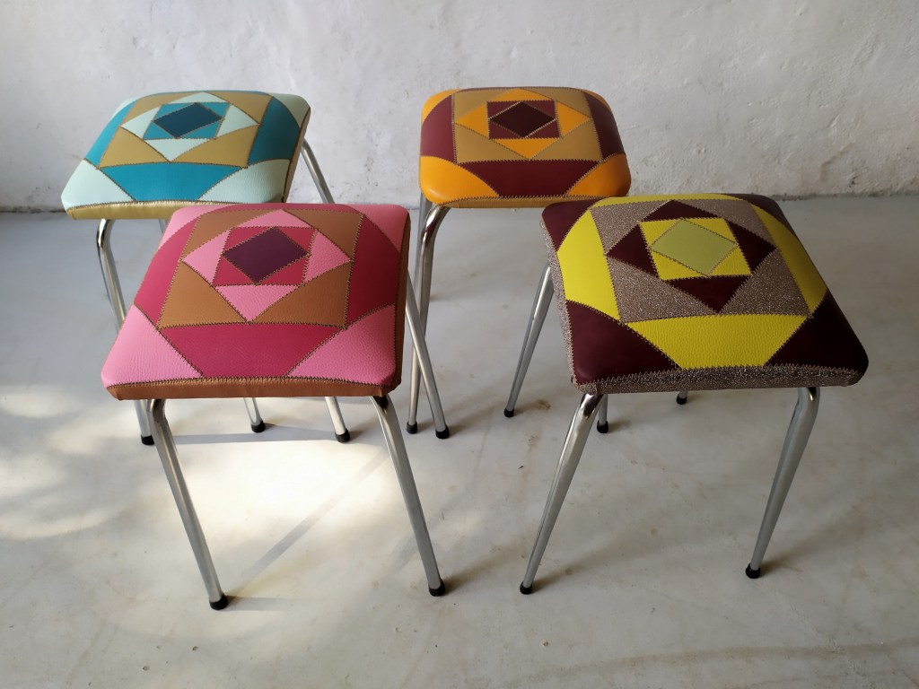 Tabourets années 60 restaurés avec des motifs géométriques. Un tabourets de couleurs bleu, turquoise et or,un de couleurs rouge, orange et or, un de couleur vert , bordeau et paillettes argent et un de couleur rose, fuchsia et bronze.Tous les patchworks sont assemblés avec des couture beiges.